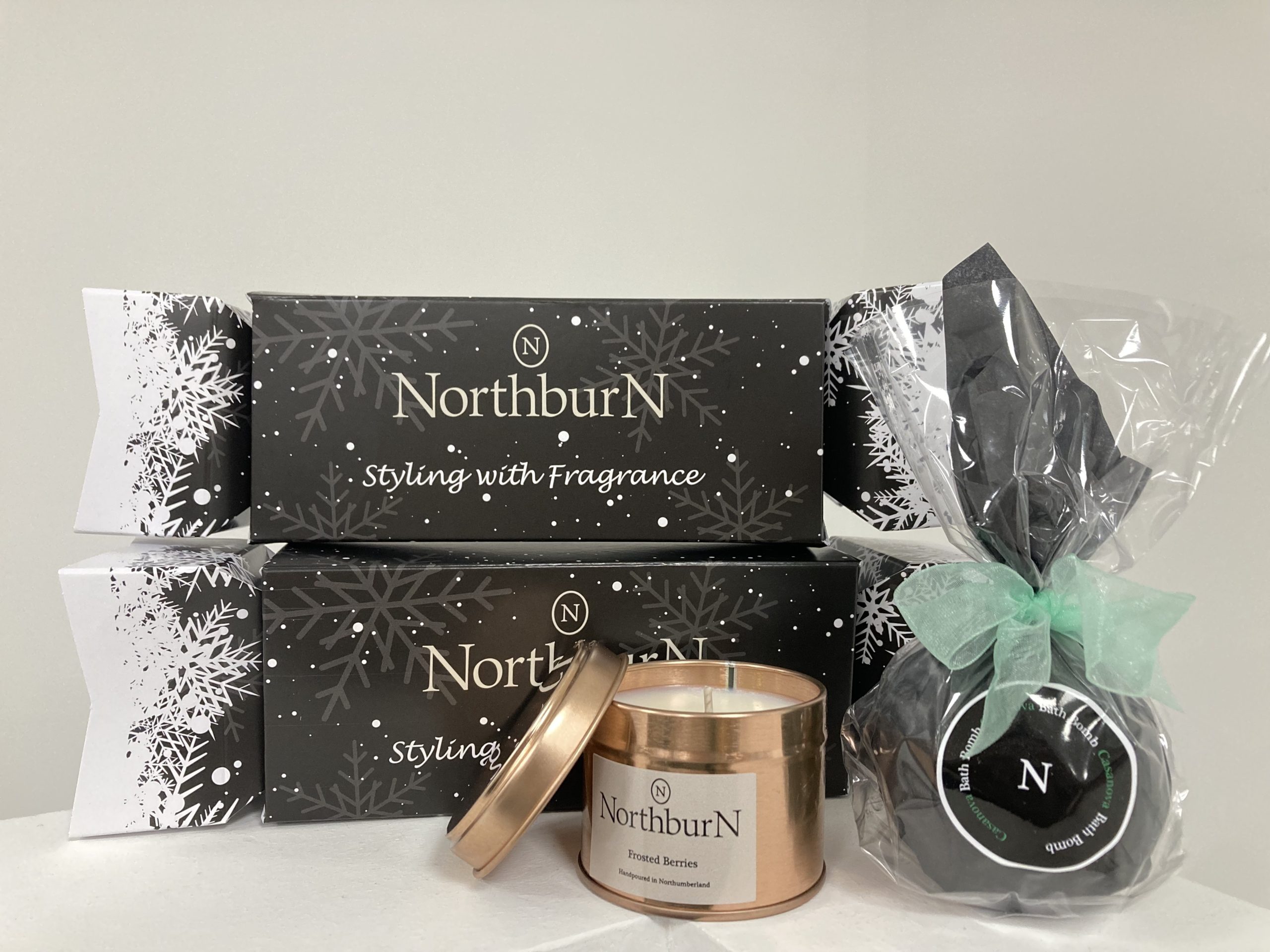 The NorthburN christmas cracker includes a travel tin candles & a mini bath bom (fragrance of bomb chosen at random depending on what is currently available)